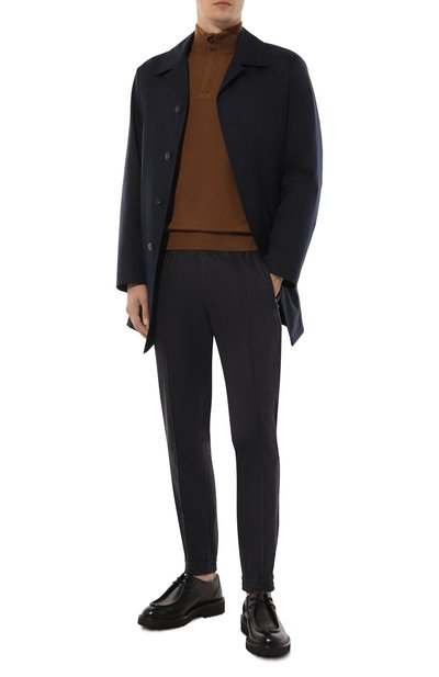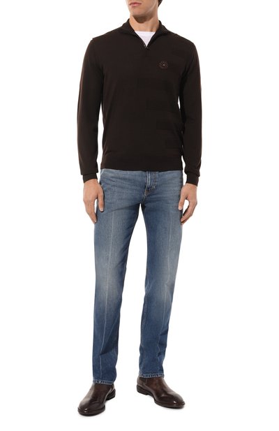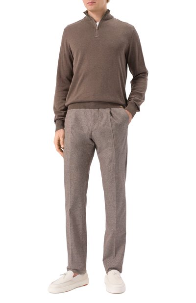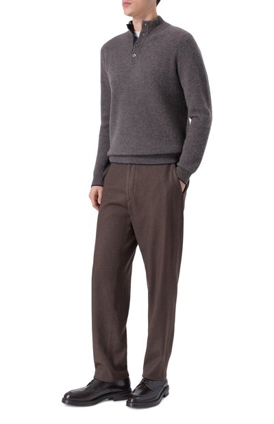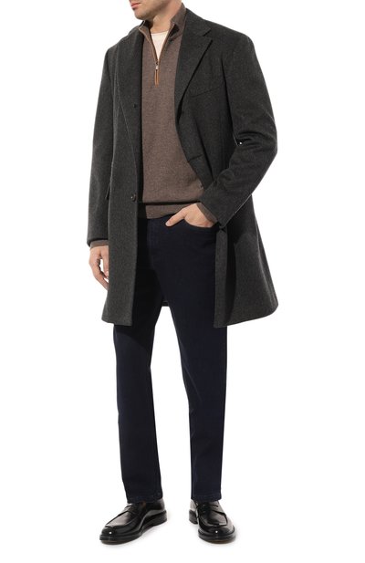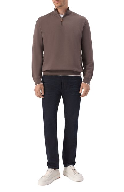 Коричневый джемпер с высокой горловиной на молнии и длинными рукавами выполнен из тонкого кашемирового трикотажа с добавлением прочного шелка. Гладкий материал настолько легкий и мягкий, что изделия из него почти не ощущаются на теле, но при этом отлично держат тепло. Комфортный casual-образ поддержат белая футболка, серые брюки и оливковые броги.