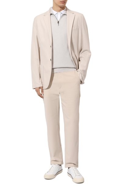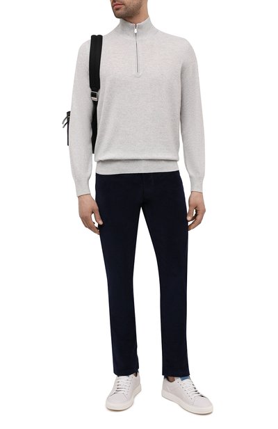 Светло-серый лаконичный джемпер с длинными рукавами и высокой горловиной, регулируемой молнией, станет удачной инвестицией в базовый гардероб. Модель выполнили из тонкого гладкого трикотажа на основе мягкого кашемира, смешанного с прочным шелком. Одежда из такого материала поддерживает комфортный ми кроклимат в переменчивую погоду, почти не ощущается на теле и долго сохраняет безупречный внешний вид.