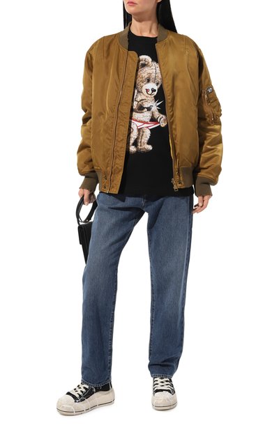 Черную футболку декорировали красочным принтом, в котором иронично обыграли эмблемы разных брендов. Мастера марки выполнили модель из мягкого эластичного джерси, связанного из волокон отборного хлопка премиальных сортов. Изделие из такого материала хорошо держит заданную кроем форму, не теряет цвет и не пилингуется после стирок.