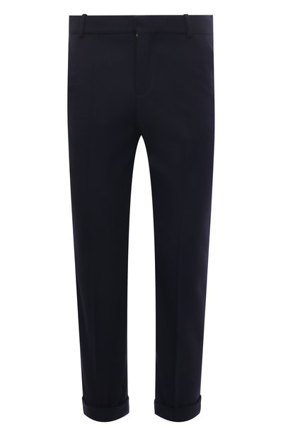 Темно-синие укороченные брюки с высокой посадкой, врезными карманами и четкими стрелками дополнены узкими отворотами. Для пошива однотонной лаконичной модели мастера марки использовали легкую гладкую шерсть. Наши стилисты предлагают создать образ с белой футболкой и черными свитером и пенни-лоферами.