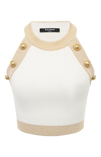 Белый укороченный топ мастера бренда, основанного Пьером Бальманом, выполнили из легкого трикотажа с фактурным микроузором, создающим ультратонкие перфорированные полосы. Мягкий материал связали из волокон шелковистой вискозы и тонкого люрекса. Блеск модели с широким золотистым кантом поддержали крупными гравированными пуговицами на линиях реглан.