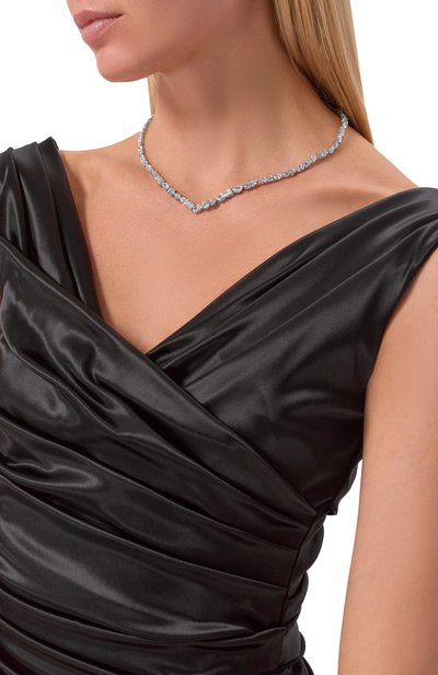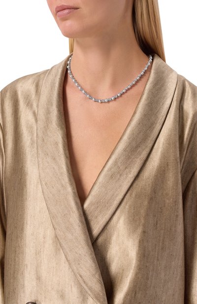 Белые фианиты бриллиантовой огранки придают этому тонкому колье сходство с цепочкой пузырьков воздуха. На украшении чередуются элементы трех размеров, каждый из которых зафиксирован в технике безель внутри круглой основы из стерлингового серебра с черным родиевым покрытием. Такая закрепка позволяет лучам света пронизывать кристаллы насквозь, поэтому их блеск становится особенно ярким.