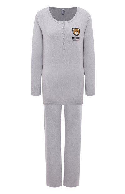 Для изготовления серой меланжевой пижамы мастера марки использовали тонкий хлопковый трикотаж, в который включили стрейчевые нити. Такой материал немного тянется, не сковывая движения, и хорошо пропускает воздух. Лонгслив с пуговичной планкой и вырезом, как у хенли, и брюки с эластичным поясом украсили небольшими брендированными принтами.