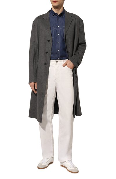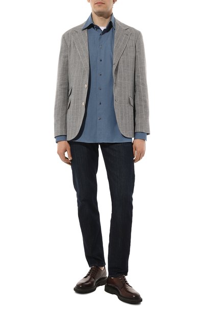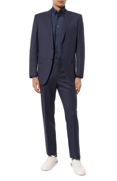 Синяя рубашка с длинными рукавами сшита мастерами марки вручную из легкого клетчатого хлопка. Фактурная мягкая ткань с шелковистым блеском отлично пропускает воздух, а одежда из нее почти не мнется. Модель прямого кроя безупречно садится по фигуре благодаря исключительному уровню конструирования и соединения деталей.