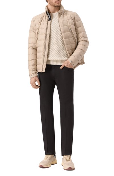 Широкие геометричные накладки из бархатистой замши и гладкой кожи на этих кроссовках обрамляют мягкую фактурную шкуру теленка. Приглушенным бежевым тонам противопоставлены черные детали: металлическая эмблема на язычке, шнуровка и трехмерная вставка на заднике. На принадлежность бренду указывает логотип, вышитый на боковой панели.
