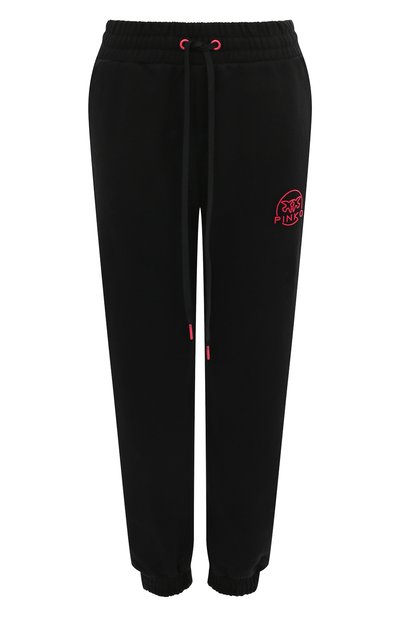 Черные джоггеры станут комфортной основой непринужденных повседневных образов. Мастера марки сшили модель из хлопкового трикотажа, который хорошо пропускает воздух. Материал немного тянется, поэтому изделие не сковывает движения. О принадлежности бренду говорит розовый логотип.