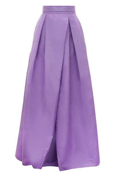 Юбка сиреневого оттенка может стать центром образа с вещами нейтральных оттенков, но наши стилисты предлагают отказаться от полумер и носить изделие с топом в тон. Для пошива модели мастера марки использовали шелковистую плотную тафту, которая хорошо держит форму. Изделие с запахом, создающим высокий разрез, завязывается на талии длинным поясом-лентой.