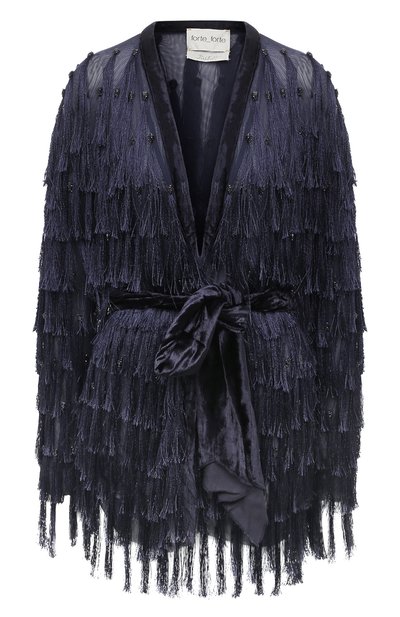 Темно-синий жакет в исполнении Джиады Форте больше напоминает вечерний наряд. Для его пошива использовали тонкий легкий тюль, на котором закрепили длинные шелковистые кисточки, чутко откликающиеся на каждое движение. Широкий пояс-лента из блестящего бархата регулирует глубину запаха и подчеркивает талию.