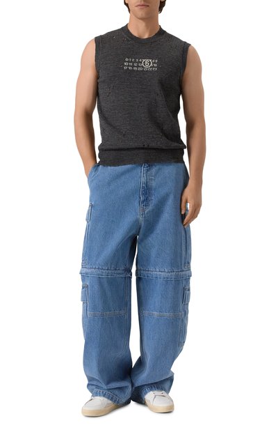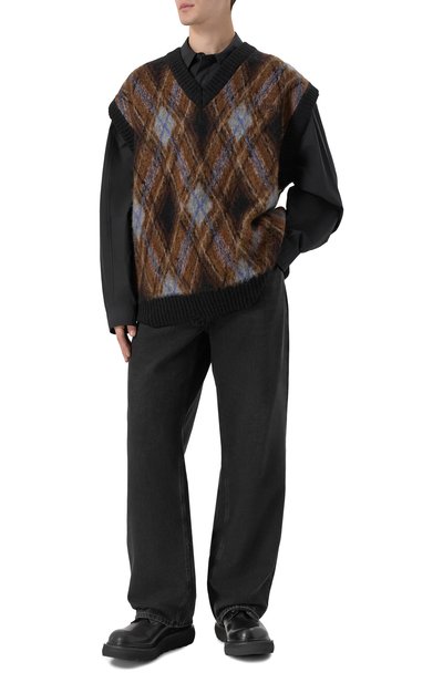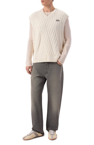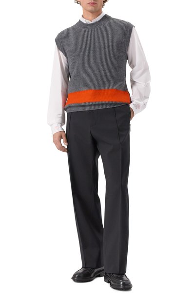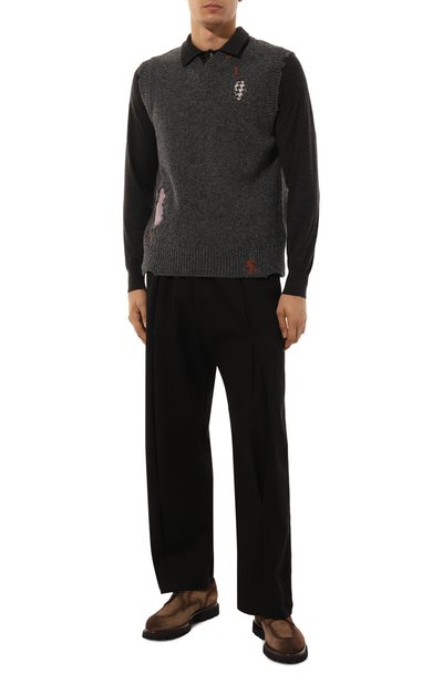 Жилет, разработанный совместно с компанией Smiley®, украсили жаккардовым мотивом в виде смайлов и сердец. Модель с рифленой горловиной, плечевыми окатами и поясом выполнили из шерсти с добавлением вискозы, кашемира и нейлона.