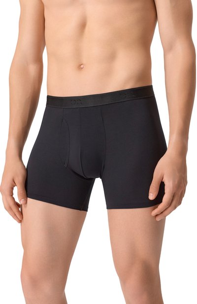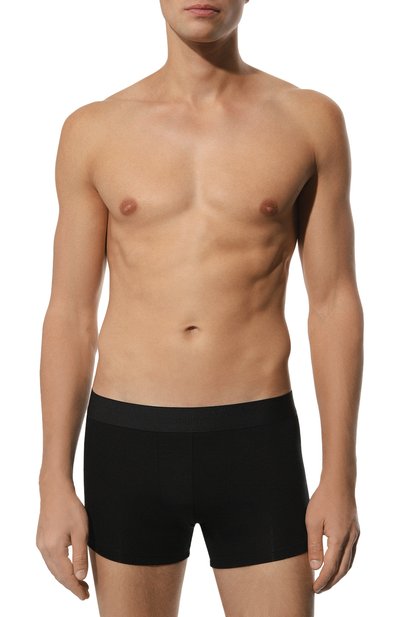 Черные боксеры комфортно облегают тело и не сковывают движения. Для изготовления модели выбрали слегка эластичный трикотаж с гладкой фактурой. Трусы дополнили широким плоским поясом, на котором только объемом выделяется паттерн, составленный из логотипа марки.