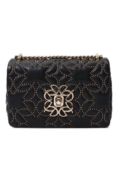 Для изготовления небольшой черной сумки Эли Сааб выбрал гладкую мягкую кожу. Полуматовый материал стал идеальным фоном для фактурного узора в виде эмблемы, подчеркнутого миниатюрными заклепками, которому вторит крупная золотистая пряжка с поворотным замком. Благодаря скользящему ажурному ремню-цепочке аксессуар удобно носить и в руке, и на плече. Внутрь поместятся смартфон, ключи и картхолдер.