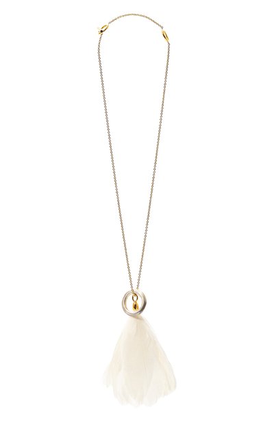 Кулон с тонкой цепочкой якорного плетения, выполненной из золотистого ювелирного сплава, может стать эффектным завершающим штрихом в образе. Для создания аксессуара использовали воздушные гусиные перья молочного оттенка. Изделие дополнили серебряным кольцом, которое можно носить отдельно, например, на одном из двух текстильных шнуров, входящих в комплект.