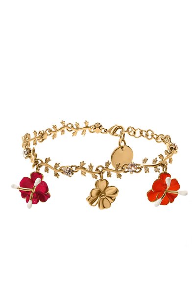 Позолоченный браслет из ювелирного сплава стилизовали под ветвь с миниатюрными листьями. Глидеры соединили круглыми вставками, инкрустированными сверкающими кристаллами. Летнее настроение аксессуару добавили подвесками в виде небольших цветов, покрытых разноцветной г лянцевой эмалью. Украшение застегивается карабином с брендированным шармом.