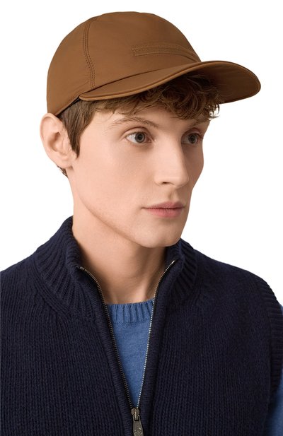 Коричневая однотонная бейсболка с жестким изогнутым козырьком и эластичным ремешком, регулирующим посадку, украшена сбоку металлической заклепкой-логотипом. Аксессуар из мягкого премиального кашемира отлично держит тепло, пропускает воздух и почти не ощущается на голове.