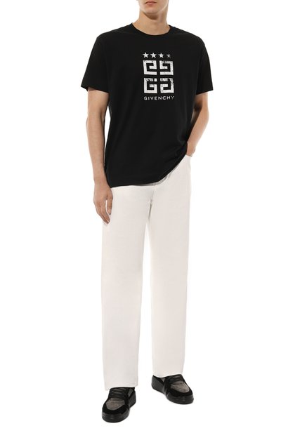 Лаконичность черной футболки нарушили контрастным белым принтом-логотипом. О принадлежности бренду, основанному Юбером де Живанши, сообщили и вышитой над поясом сзади эмблемой 4G. Для создания модели использовали тонкое эластичное джерси из отборного длинноволокнистого хлопка, которое идеально пропускает воздух.