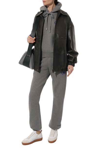 Меланжевые джоггеры с поясом-кулиской и манжетами в рубчик выполнили из кашемирового трикотажа. Модель дополнили накладным карманом сзади.