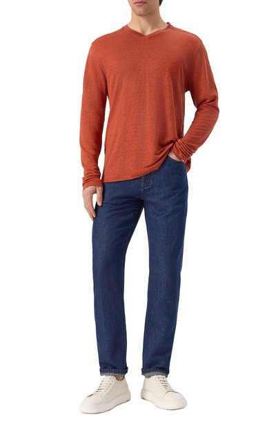 Оранжевый лонгслив словно сшили из шелка. Чтобы сформировать такую иллюзию, ультрадлинные волокна премиального хлопка для мягкого джерси обработали в технике мерсеризации, сделав их более гладкими, прочными и эластичными. Модель из такого трикотажа, деликатно сияющего в лучах света, хорошо пропускает возд ух и приятно ощущается на коже. Изделие украсили вышитым октагоном с инициалами Стефано Риччи в центре.