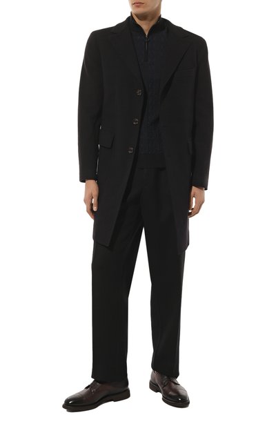 Джемпер с круглой горловиной мастера марки связали фактурным узором, напоминающим крупное плетение. Нити двух оттенков темно-синего делают орнамент особенно рельефным и создают эффект оптической иллюзии. Для изготовления модели с миниатюрной фирменной накладкой на низе использовали нежный длинноволокнистый кашемир с добавлением гладкого шелка.