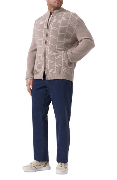 Бежевый кардиган с крупным клетчатым узором спереди обеспечит комфорт в прохладные дни межсезонья. За поддержание оптимального микроклимата отвечает материал. Мастера марки, основанной Стефано Риччи, выполнили модель из мягкого кашемира с добавлением премиальной шерсти, которые хорошо сохран яют тепло. Принадлежность изделия бренду обозначили восьмиугольными пуллерами с изображением знакового орла, которым вторит накладка сзади.