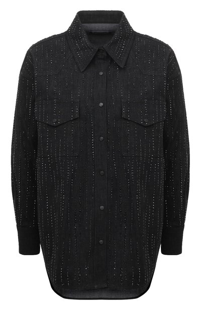 Черная джинсовая рубашка сияет, когда на нее попадают лучи света. Чтобы добиться множества бликов, модель украсили миниатюрными стразами, собрав из них вертикальный узор в полоску. Для пошива изделия с удлиненной спинкой и фигурной линией низа мастера марки использовали мягкий плотный материал на основе хлопка.