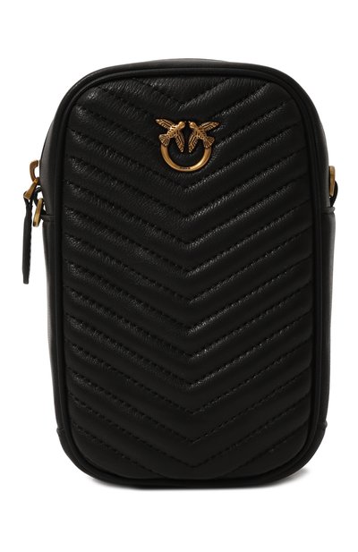 Черную мини-сумку со съемным плечевым ремнем-цепочкой украшает миниатюрная фирменная эмблема Love birds. Декор цвета античного золота вписали в шевронный узор, который простегали на мягкой коже наппа. Во внутренние слоты поместятся четыре кредитные карты, а в основное отделение – смартфон.