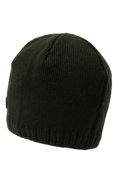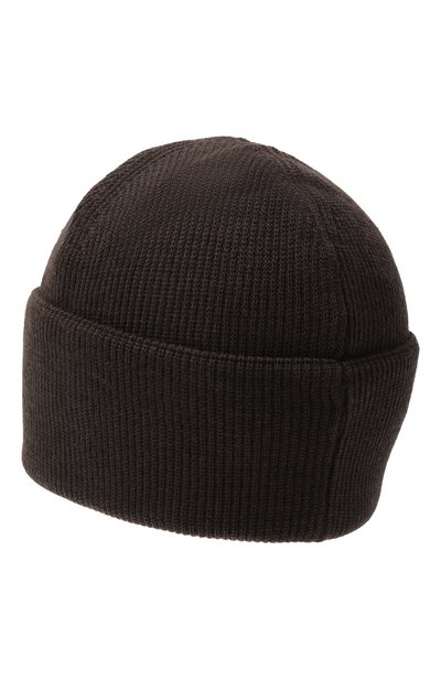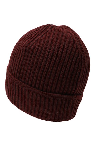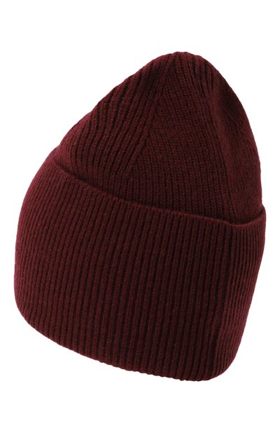 Шапку бини выполнили в технике резинки из переработанной шерсти, укрепленной полиамидом. Широкий отворот украсили брендированным патчем фирменного алого оттенка.