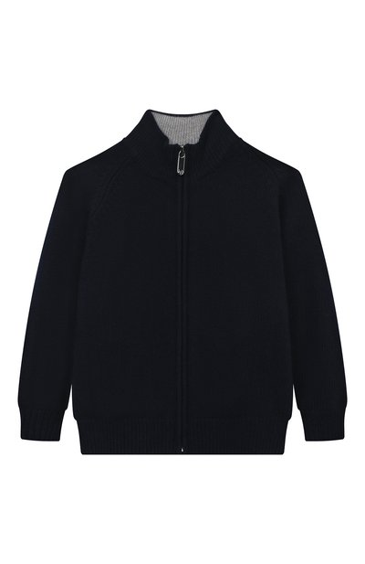 Темно-синий кардиган, застегивающийся молнией, изготовлен из тонкой шерстяной пряжи. Ее мягкие волокна не раздражают кожу, а изделия из такого материа ла поддерживают комфортный микроклимат и не пилингуются. Длинные рукава реглан дополнены круглыми серыми заплатками на локтях.