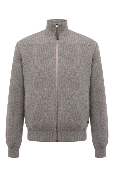 Серый меланжевый бомбер стилизовали под кардиган с воротником-стойкой. Для изготовления модели вместо привычной ткани использовали мягкий трикотаж из отборного кашемира, которому нет равных в сохранении тепла. Чтобы в куртке было еще комфортнее в холодную погоду, ее дополнили тонким слоем синтепона, поддерживающего оптимальный микроклимат и не создающего лишний объем. Изделие застегивается молнией с длинным кожаным пуллером.