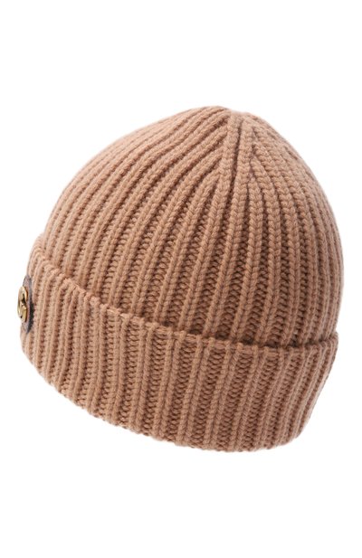 Шапку бини оттенка camel связали рифленым эластичным узором из нежного кашемира. Материал не колется и отлично сохраняет тепло, но не препятствует циркуляции воздуха, поэтому в изделии будет комфортно и в морозную погоду, и в случае внезапной оттепели. Широкий отворот, котор ый делает посадку плотнее и защищает от ветра, украсили кожаным патчем с тисненым логотипом.