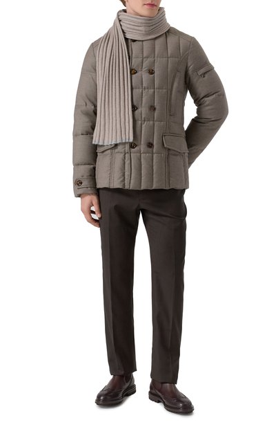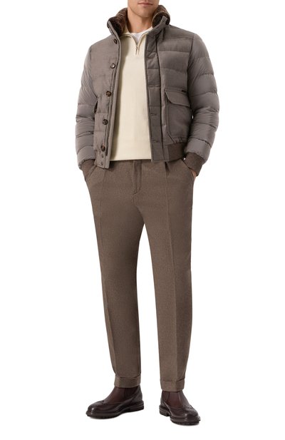 Для изготовления коричневой куртки использовали мягкую плотную фланель на основе легкой шерсти, в состав которой добавили волокна нежного кашемира. По стеганым камерам равномерно распределили отборный гусиный пух, поэтому в таком изделии будет комфортно в холодную погоду. Съемная вставка с воротником-стойкой, выполненная из шелковистого нейлона, обеспечивает дополнительную защиту от ветра.