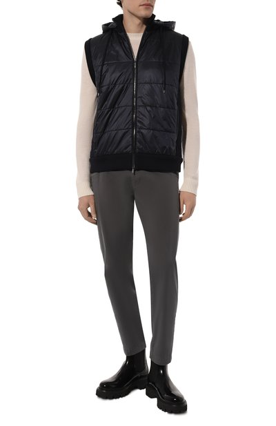 Создавая темно-синий стеганый жилет, дизайнеры бренда предпочли традиционному нейлону плотную шерсть с добавкой кашемира. Текстиль обработали водоотталкивающим составом, поэтому изделие надежно защищает от любых капризов погоды. Внутри модели с отстегивающимся капюшоном — невесомый гусиный пух, равномерно распределенный по камерам потоком сжатого воздуха.
