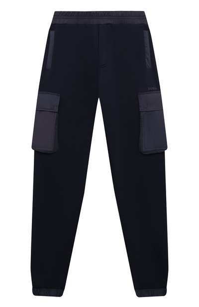 Для пошива темно-синих карго с завышенной посадкой использовали разные по фактуре материалы. Модель выполнили из мягкого хлопкового трикотажа, а для пояса, манжет и объемных накладных карманов выбрали плотный шелковистый текстиль. Сбоку — прорезиненный миниатюрный логотип марки.