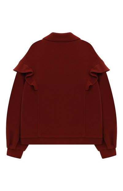 Бомбер глубокого бордового оттенка делает романтичнее широкая расклешенная оборка, подчеркивающая линию плеч. За комфорт в холодную погоду межсезонья отвечает плотная фактурная ткань из мягкой шерсти и прочного нейлона. Модель с отложным воротником и объемными накладными карманами застегивается молнией, скрытой под штормовой планкой.