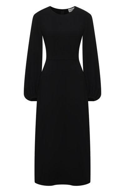 Черное миди-платье выглядит предельно лаконично: базовый цвет и полное отсутствие декора. Для пошива модели с длинными объемными рукавами выбрали тонкий плотный материал, который почти не мнется, долго сохраняя безупречный внешний вид. Изделие с круглым вырезом застегивается сзади потайной молнией.