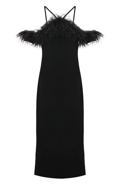 Черное платье с узкими бретелями дизайнеры марки украсили пышной отделкой из почти невесомых перьев, чутко реагирующих на каждое движение. Для пошива приталенной модели использовали мягкий эластичный полиэстер с деликатным блеском. Сзади на изделии выполнили высокий разрез, эффектно открывающий ноги.