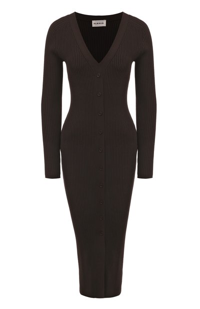 Темно-коричневое вязаное платье с V-образным вырезом садится точно по фигуре, эффектно подчеркивая силуэт. Для создания модели использовали нежную пряжу из шелковистой тонкой вискозы с добавлением нейлона, придающего прочность. Эластичный легкий материал хорошо тянется и исключительно приятно ощущается на коже.