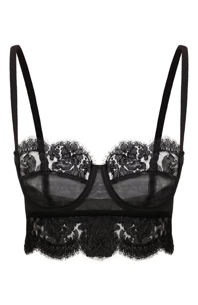 Бюстгальтер-балконет с мягкими чашечками на косточках выполнили из цветочного кружева и тюля. Отрегулировать посадку бюстье помогут слайдеры на узких бретелях с брендированным паттерном и четыре крючка с двумя позициями на широком поясе.