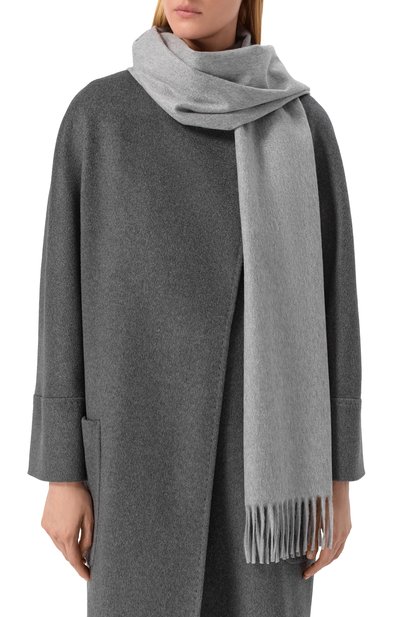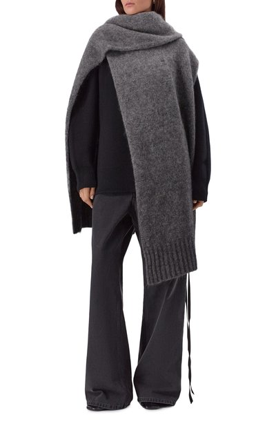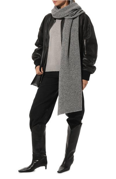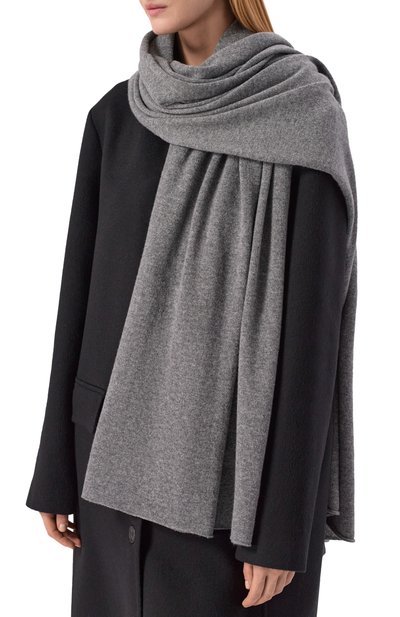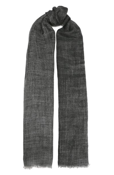Черный меланжевый шарф выполнили из легкого нежного кашемира. Широкий аксессуар из такого материала получился особенно теплым и настолько тонким, что его можно сложить в несколько раз, и при этом он не будет выглядеть объемным. Длины изделия хватит, чтобы сформировать драпировки или дважды обернуть его вокруг шеи.