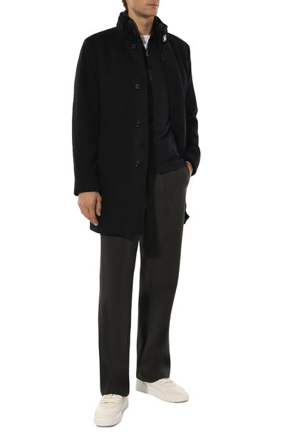 Темно-синее однобортное пальто сшили из мягкой шерсти beaver cloth с особо плотным переплетением нитей. Такой материал не пропускает ветер, отталкивает влагу и хорошо сохраняет тепло. Тончайший кашемир в составе делает полотно легче. Защиту от холода усиливают стеганая съемная подкладка с внутренними карманами и воротник из короткостриженой овчины.
