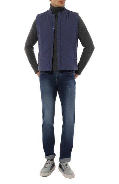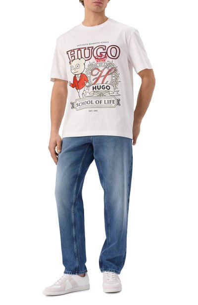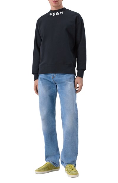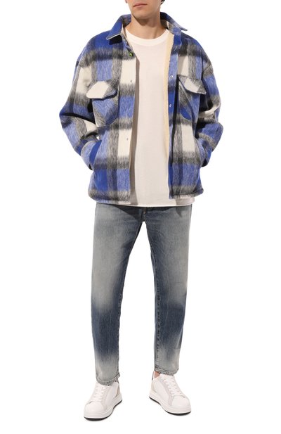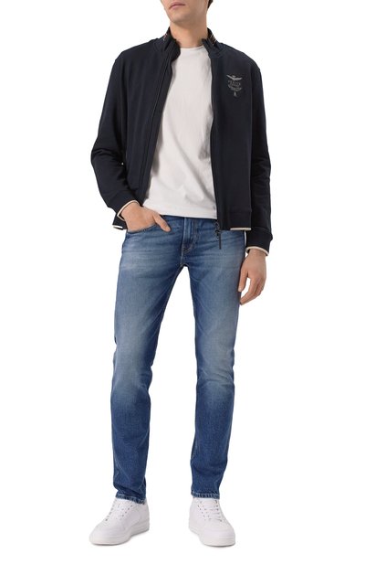 Джинсы прямого кроя сшиты из плотного денима с декоративными заломами и потертостями. Один из пяти карманов украшен миниатюрными звездами — символами марки. Пояс дополнен брендированным патчем.
