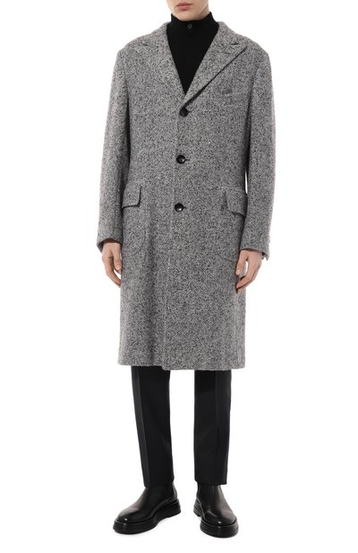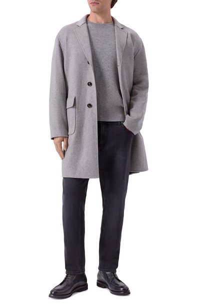 Серое двубортное пальто выполнили из меланжевого кашемира. Для его изготовления использовали пух высокогорных коз, который вычесывают только один раз в году во время естественной линьки животных. Ценные волокна обрабатывают исключительно вручную, удаляя попавшую в сырье более жесткую остевую шерсть. Модель из такого текстиля поддерживает комфортный микроклимат.