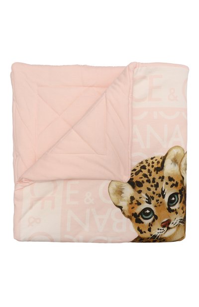 Светло-розовое одеяло с принтом в виде тигрят на фоне паттерна из логотипов на лицевой стороне сшили из мягкого дышащего хлопка, который приятно ощущается на коже и быстро впитывает влагу. Стеганая м одель, дополненная слоем объемного, но легкого синтепона, почти ничего не весит и хорошо удерживает тепло, поэтому подойдет и для дома, и для прогулки в коляске.