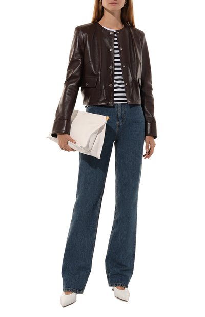 Футболка с круглым вырезом сшита из джерси на основе органического хлопка. Эластичная модель в полоску украшена спереди миниатюрным логотипом марки. Предлагаем создать образ с джоггерами и кедами.
