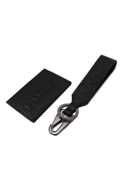 Черный картхолдер с четырьмя слотами для кредитных карт выполнили из мягкой прочной кожи, отполированной до деликатного блеска. Из такого же материала изготовили брелок, который доп олнили кольцами для ключей и крупными карабинами из легкого металла. Принадлежность аксессуаров марке подчеркнули фактурным тиснением в виде логотипа.