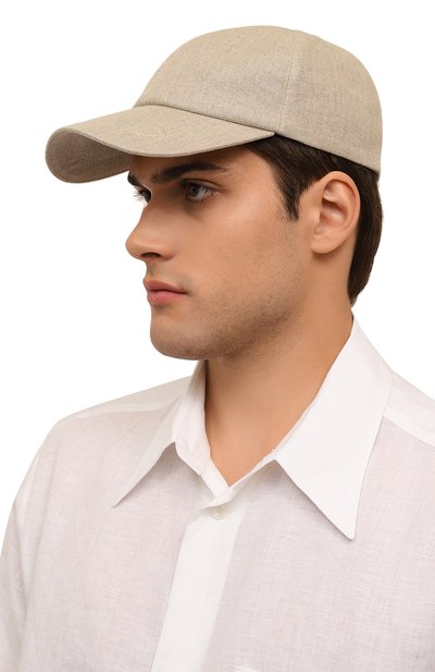 Бейсболку кремового оттенка выполнили из ворсистого кашемирового фетра. Сырье из ценного пуха горных коз промыли в ключевой воде и вычесали ворсовальными шишками, поэтому модель получилась особенно мягкой и приятной на ощупь. Аксессуар с эластичным ремешком декорировали серебристой фирменной накладкой сбоку.