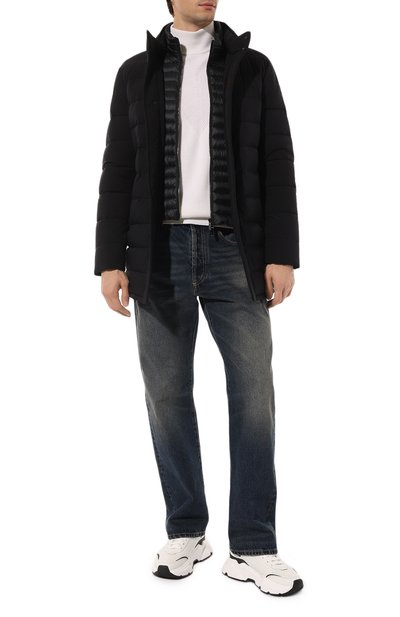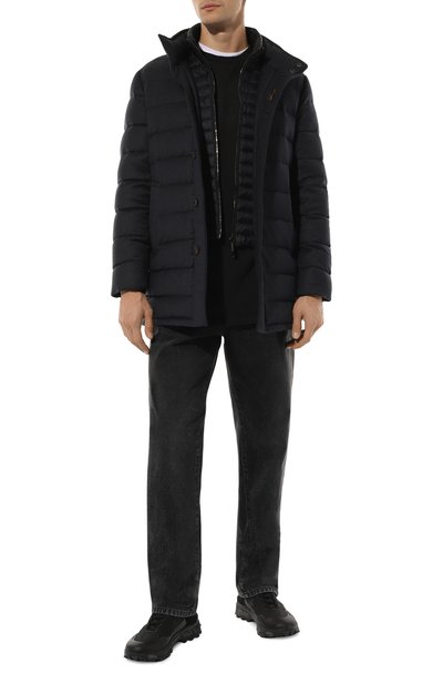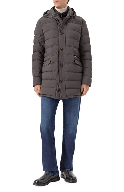 Стеганую куртку Calegari-L со шлицей на кнопках сзади, тремя внутренними и парой внешних карманов выполнили из фланели на основе шерсти первого пострига с добавлением кашемира. Изделие с брендированным ярлыком спереди утеплили гусиным пухом. Модель со съемной манишкой, дополненной воротником-стойкой, застегивается молнией и штормовой планкой с роговыми пуговицами.