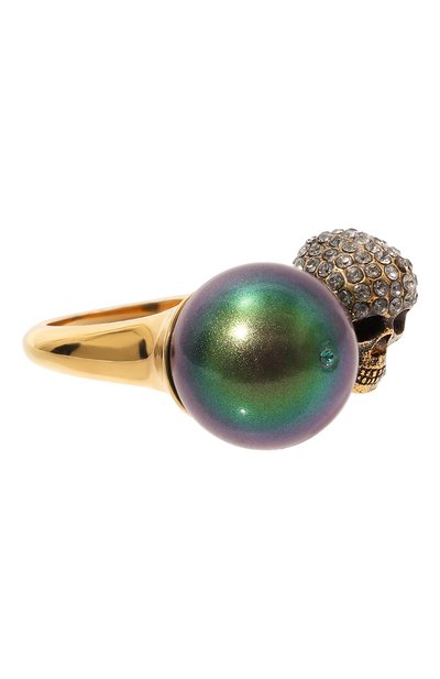 Незамкнутому кольцу придали сходство с украшением из фамильной шкатулки. Для этого на аксессуар из отполированного ювелирного сплава нанесли покрытие цвета старинного золота. Один конец декорировали зеленой металлизированной бусиной, другой — вставкой в форме знакового черепа, инкрустированного сверкающими миниатюрными кристаллами Swarovski.
