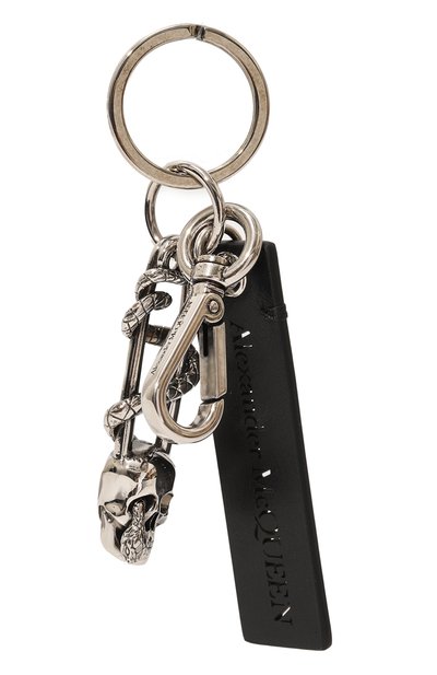 Крупный акцентный брелок громко заявляет о своей принадлежности бренду, основанному Александром Маккуином. Логотип марки выгравировали на кольце и карабине и оттиснули на черной кожаной подвеске. Кроме того, фирменными символами — черепом и змеей — украсили эффектный шарм-булавку .
