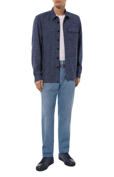 Клетчатая рубашка из очень мягкой шерстяной фланели поддержит оптимальный микроклимат. Шелк придает текстилю особую нежность и не позволяет пилинговаться, а лен формирует чуть неровную фактуру. Мастера неаполитанской марки искусно раскроили материал, поэтому мелкий черно-синий рисунок не нарушается на кок етке, планке с контрастными пуговицами и нагрудном кармане с декоративными алыми стежками.