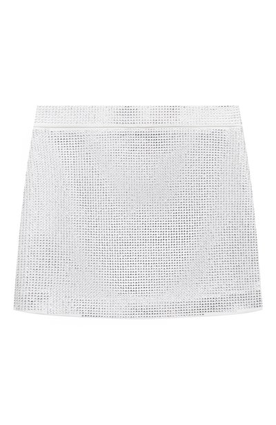 Белая короткая юбка из плотного мягкого крепа эффектно переливается в лучах света радужными бликами. Такую выразительность прямой модели добавила аппликация из прозрачных сверкающих кристаллов, полностью покрывающая переднюю сторону. Этот же декор на широком поясе акцентирует внимание на талии.